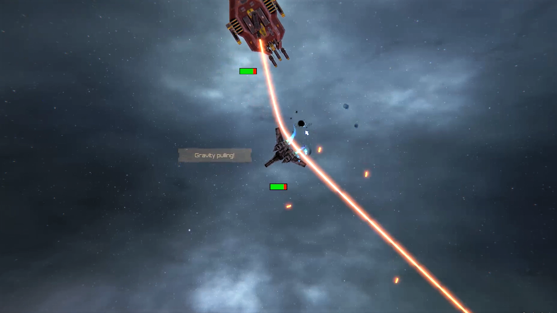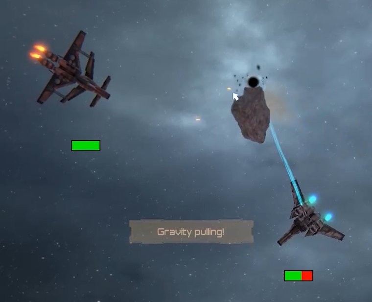 For the gravity physics, that is the foundation of the gravity gun, the real Newton’s law of universal gravitation is used. Furthermore, each object that can be manipulated via gravity has a specific mass and density. Therefore its reactions to the gravity are calculated accordingly. This holds for every object except planets. Because manipulating enemy bullets via gravitational force was found out to be hard during testing. Especially if the projectiles should be altered back to the enemies. That is why we introduced our wormhole mechanic. This enables the player to pull in enemy bullets into the black hole of the gravity gun (via left-click). After that, he can push them out of the wormhole (via right-click) and into the hostile ship. During playtesting this mechanic (that is not necessary to use), improved fun and player engagement.